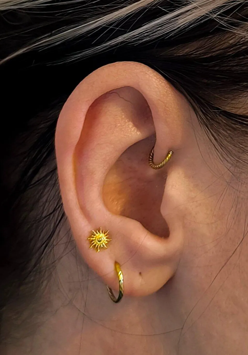Endless warmth, captured in form. The Eternal Sun Piercing features fluid, radiating rays surrounding a softly domed centre, creating an organic sun-inspired silhouette. Designed for comfortable, everyday wear, it brings a sense of energy and timeless glow to your piercing line-up without feeling overpowering.