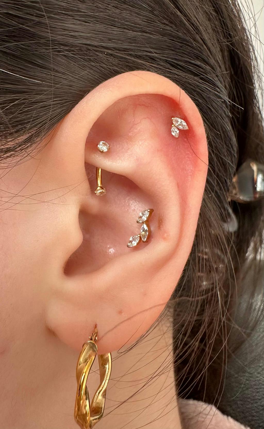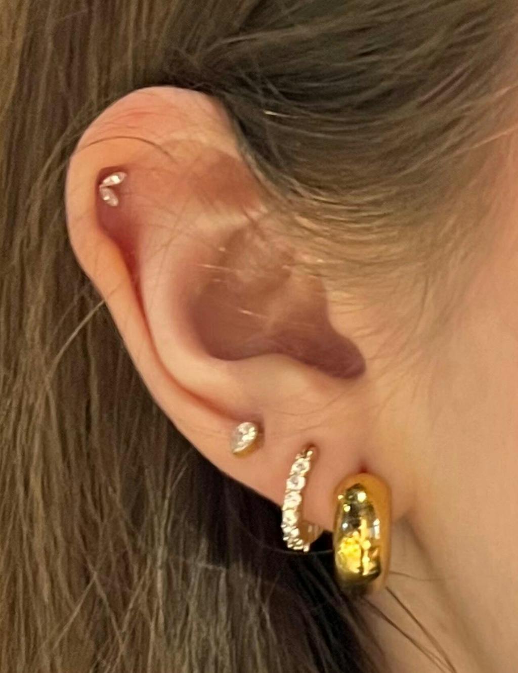 Classic sparkle with a softly structured finish. The White Marquise Cluster Piercing features three marquise-cut stones grouped together to reflect light from every angle, creating a clean yet eye-catching effect. Designed for comfort and versatility, it’s an easy staple for everyday styling.