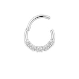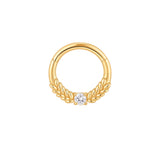 A little sparkle, framed beautifully. The Victory Wreath Clicker features a laurel-inspired design set with a central white cubic zirconia, bringing soft detail and subtle shine to a classic clicker hoop. Designed for everyday piercings, this hinged clicker feels refined, comfortable, and easy to style solo or stacked.