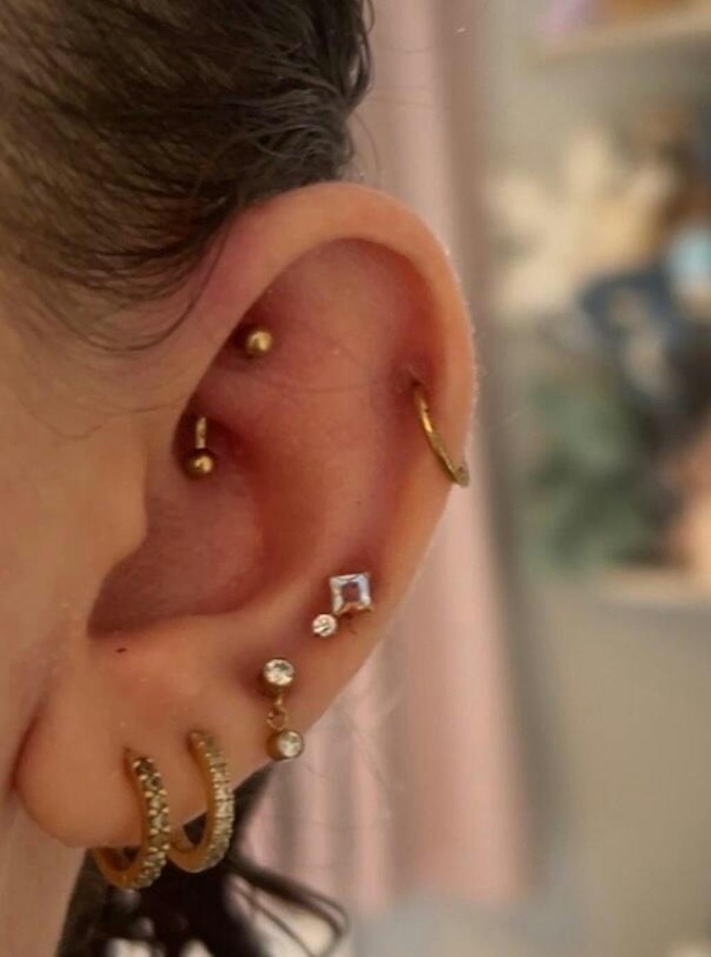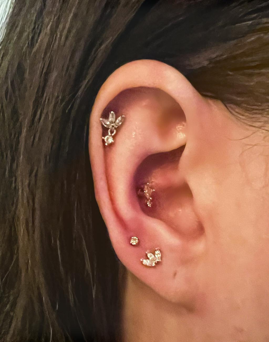 This earring is stunning. I bought a few pairs here to create a comfy stacks this one goes so well in the conch piercing and is comfy and I can finally sleep pain free!
