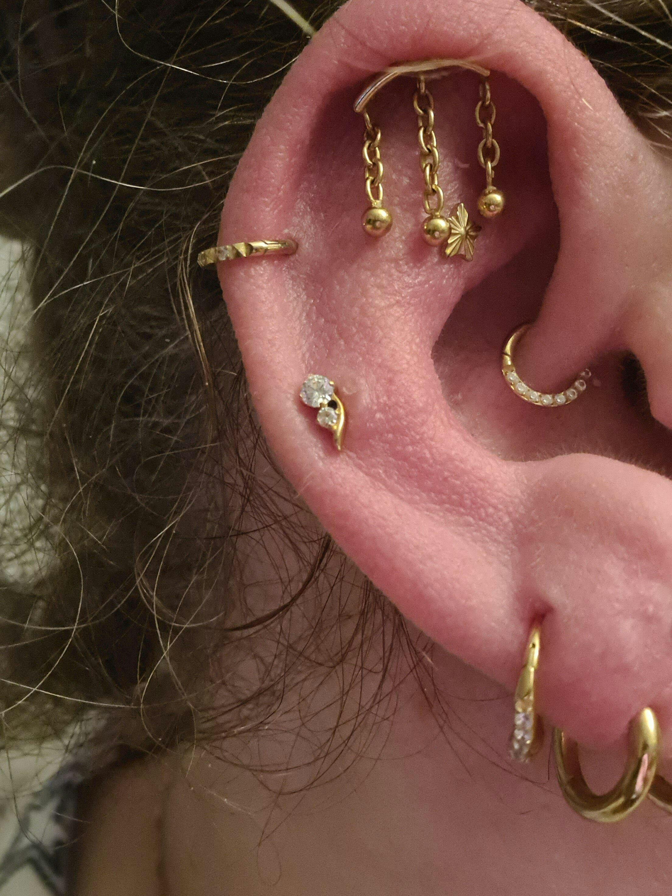 Beautiful earring. Ive put it in my helix but im sure it will look gorgeous anywhere. As it is internally threaded it was a bit fiddly to put in but it was definitely worth it in the end. Good quality as it hasn’t caused any irritation to my sensitive ears. Exactly what i was hoping for.