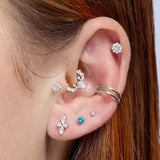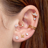 The Crystal Flower Bloom Piercing brings floral charm with a burst of crystal shine. Its symmetrical bloom design adds a sweet, radiant detail to any ear stack.